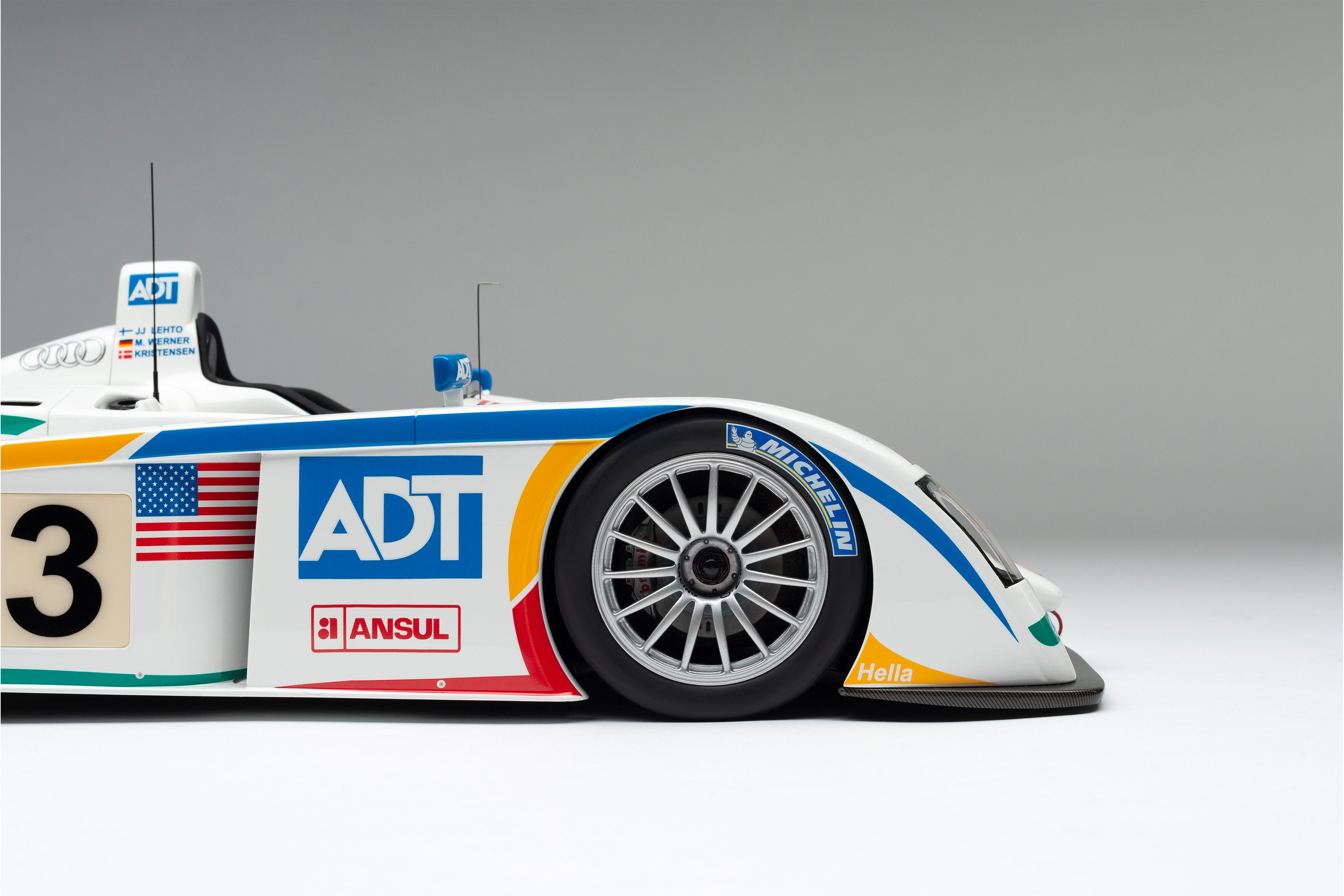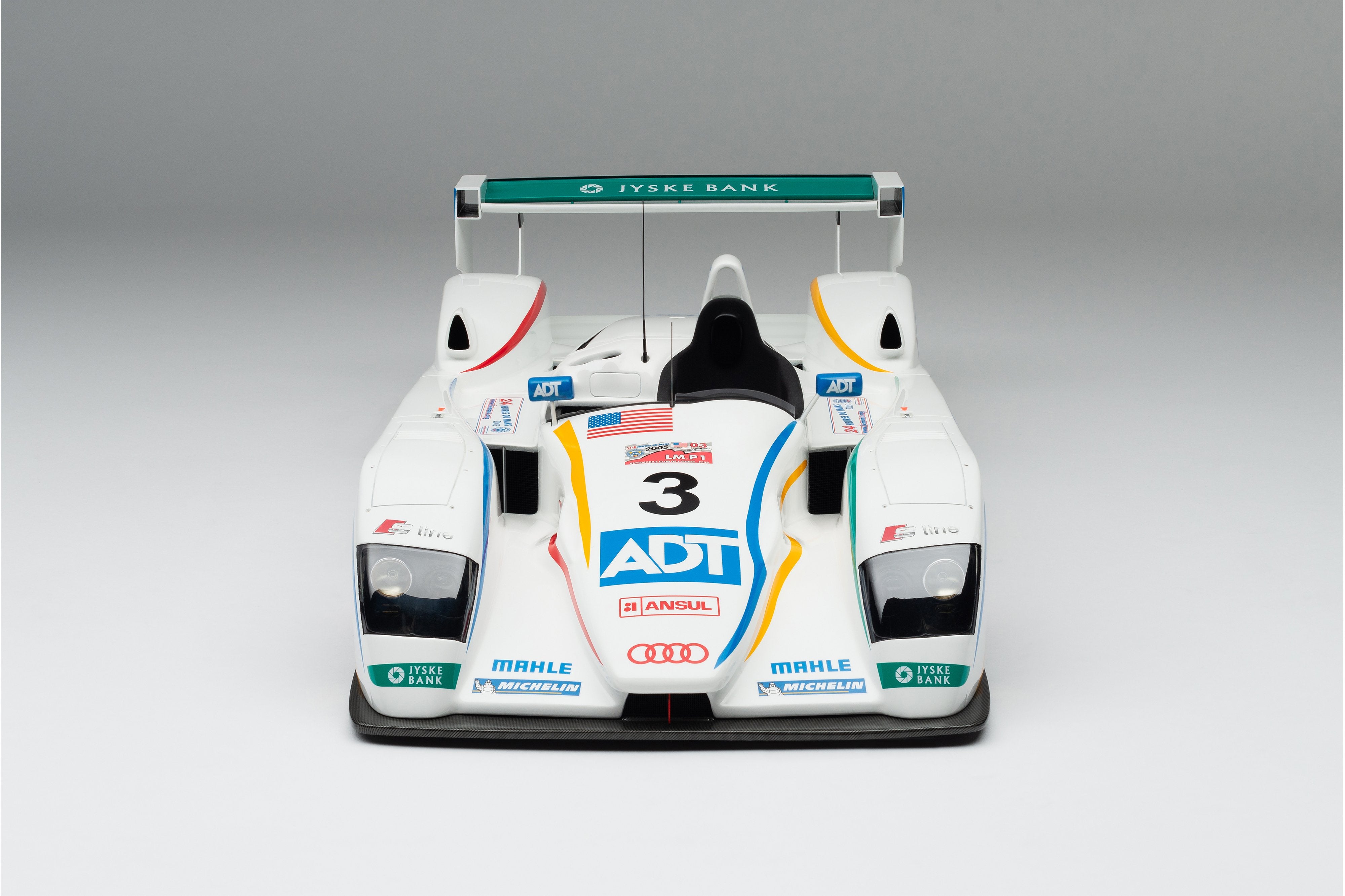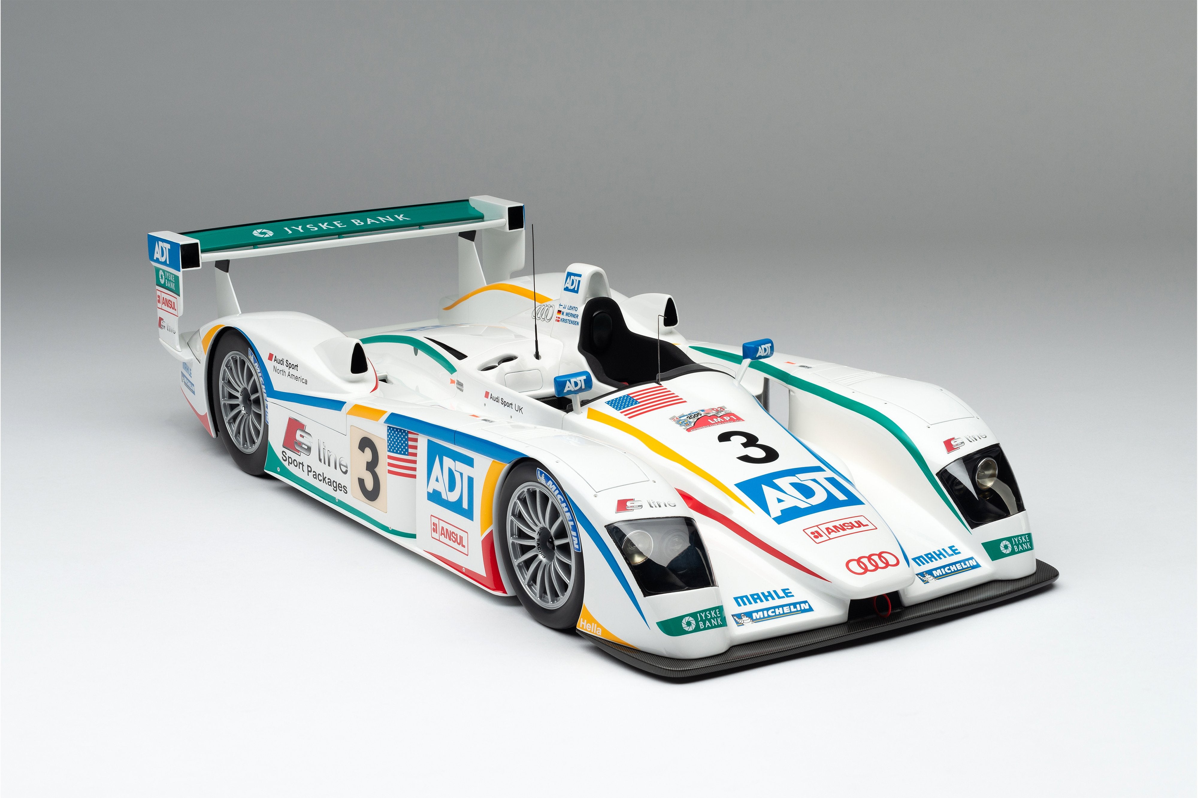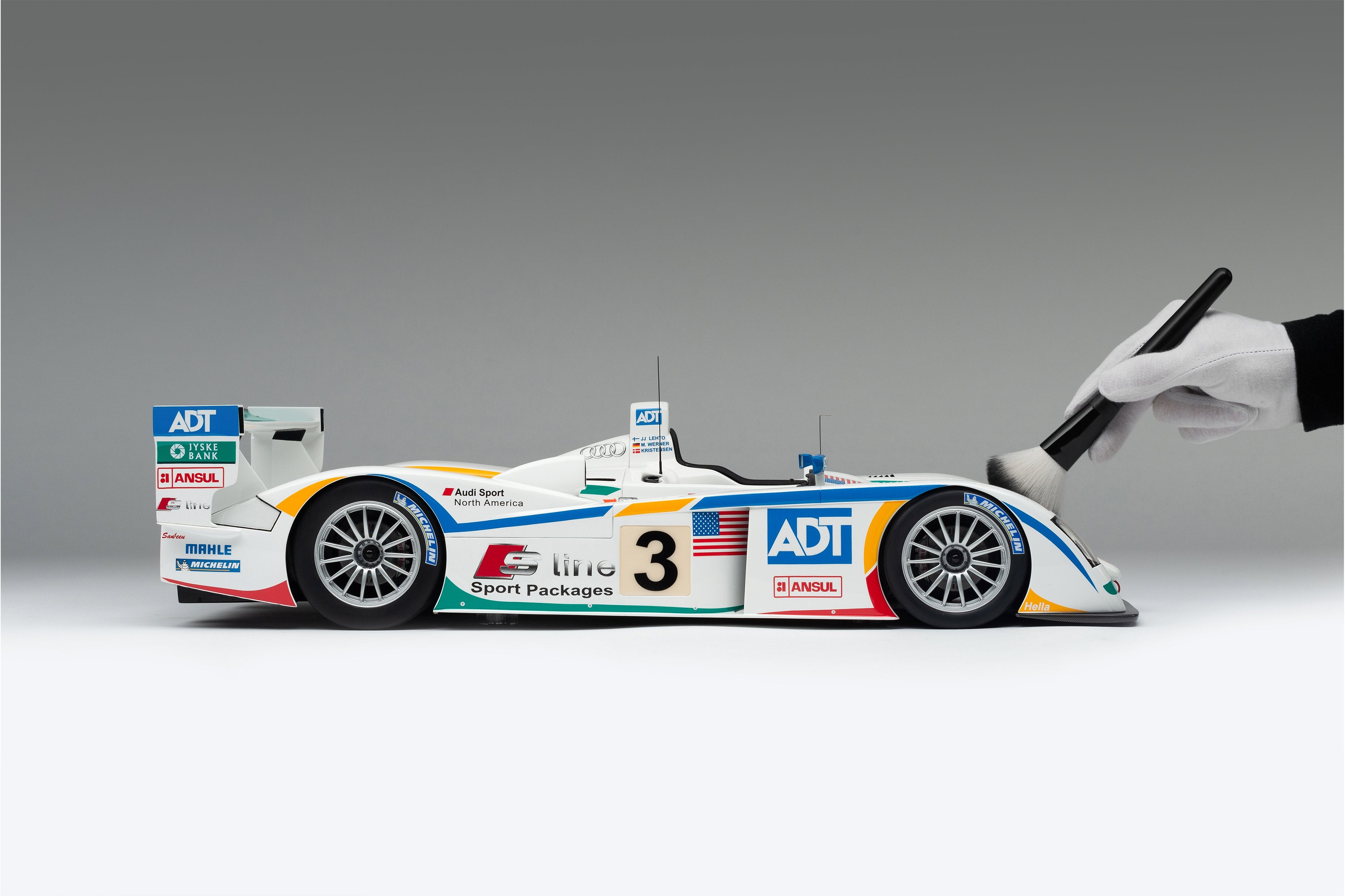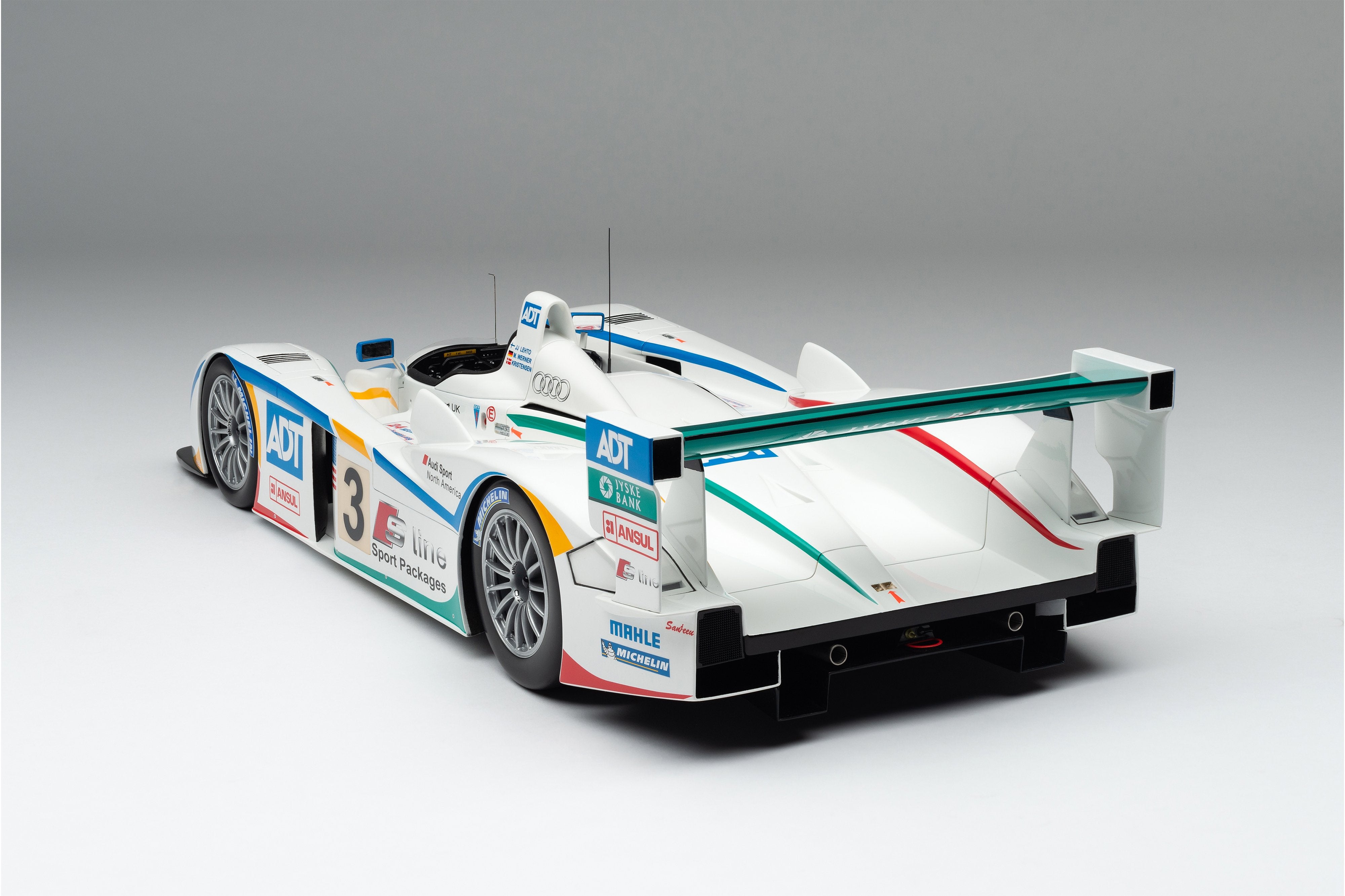 This model is a replica of the 2005 ADT Champion Racing No. 3 car which took Audi’s fifth Le Mans crown and sealed Tom Kristensen’s place in Le Mans history as he became the most successful Le Mans driver of all time. Piloted by Kristensen, JJ Lehto and Marco Werner, the No.3 qualified eighth, 4.2 seconds behind the leading Pescarolo. A flawless race, however, saw them slowly creep up the places and, by the third hour, they had overtaken their No. 2 sister car, driven by Frank Biela, Allan McNish and Emmanuele Pirro, after Pirro locked his cold tyres heavily on the run to Arnage corner and made contact with a tyre barrier.