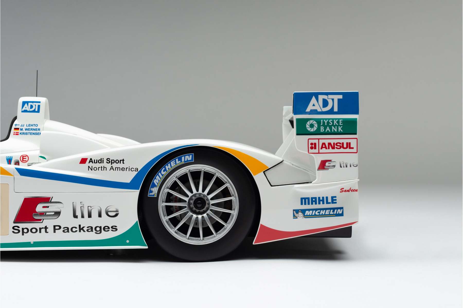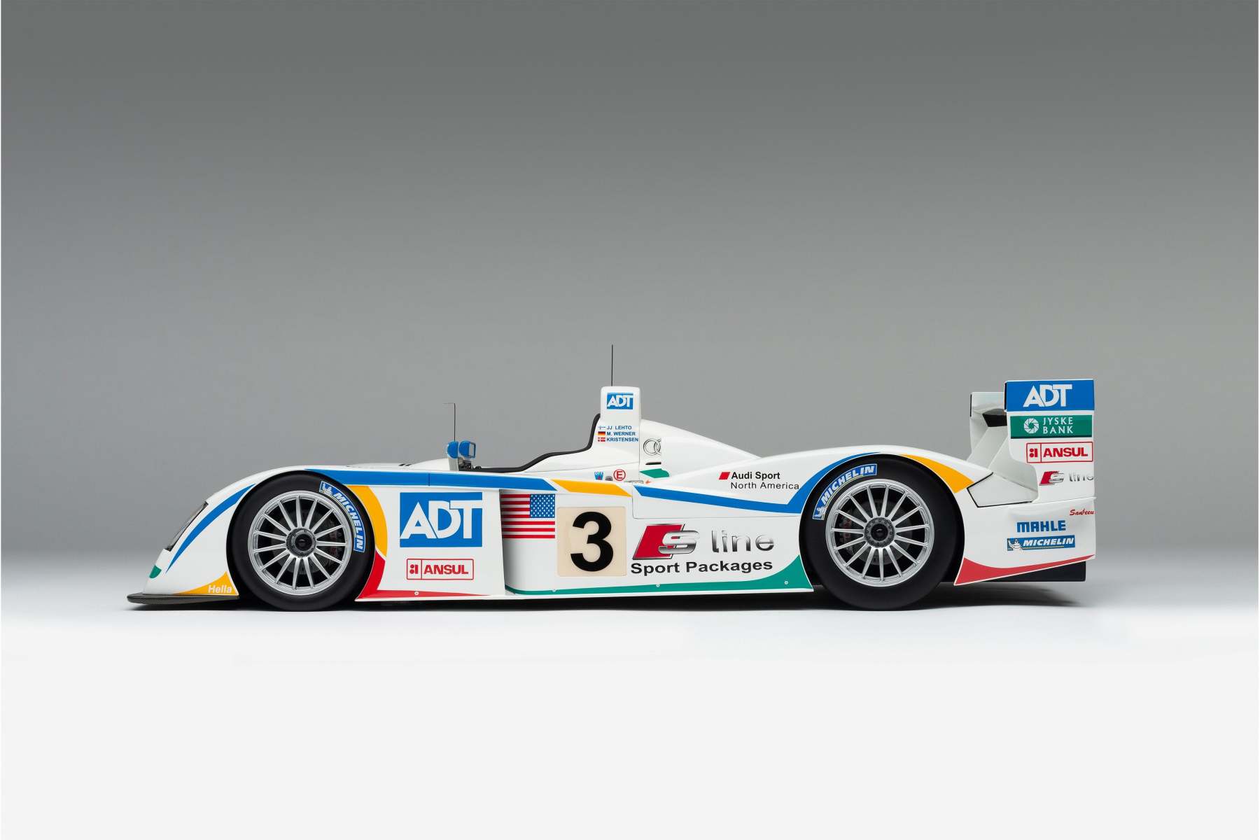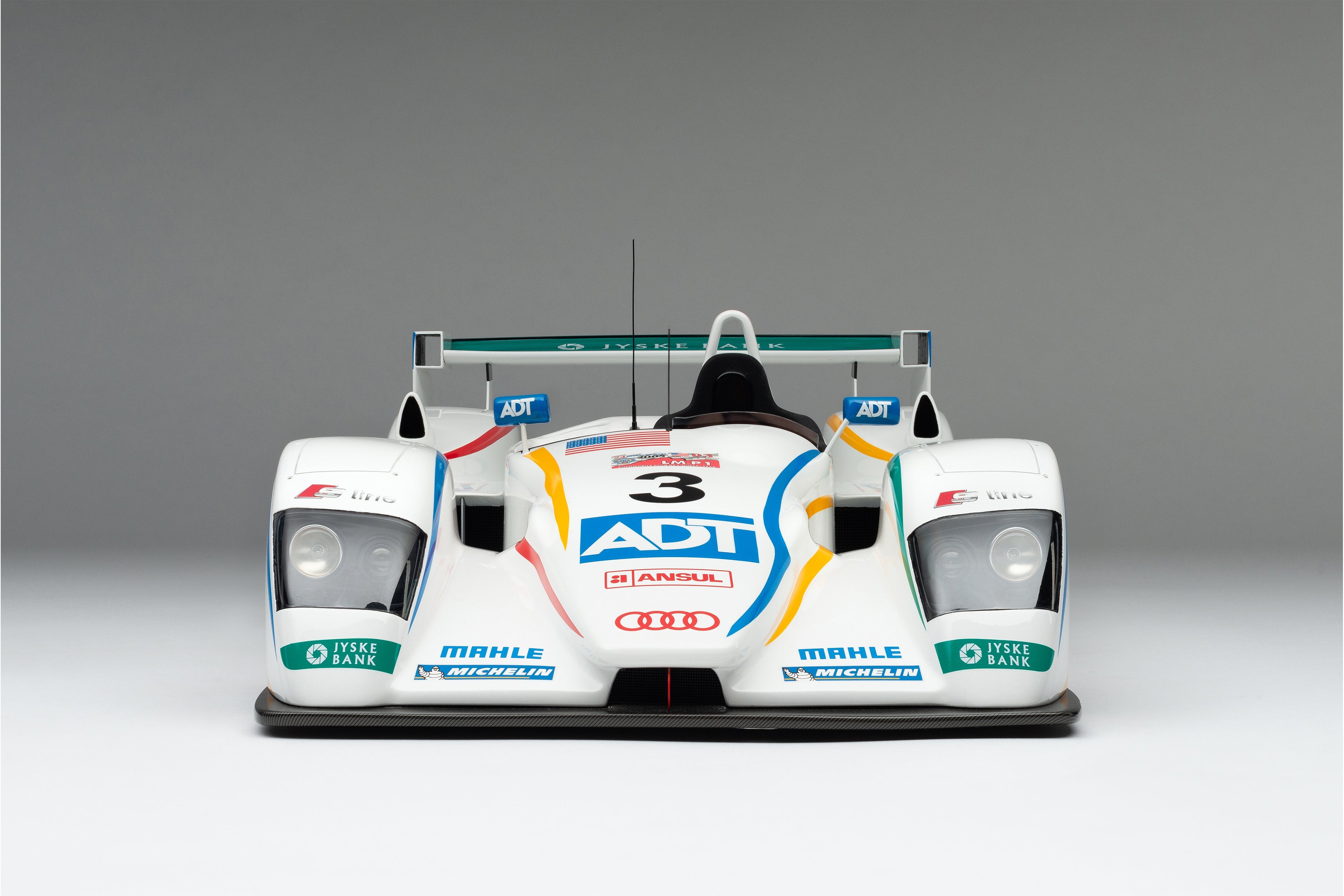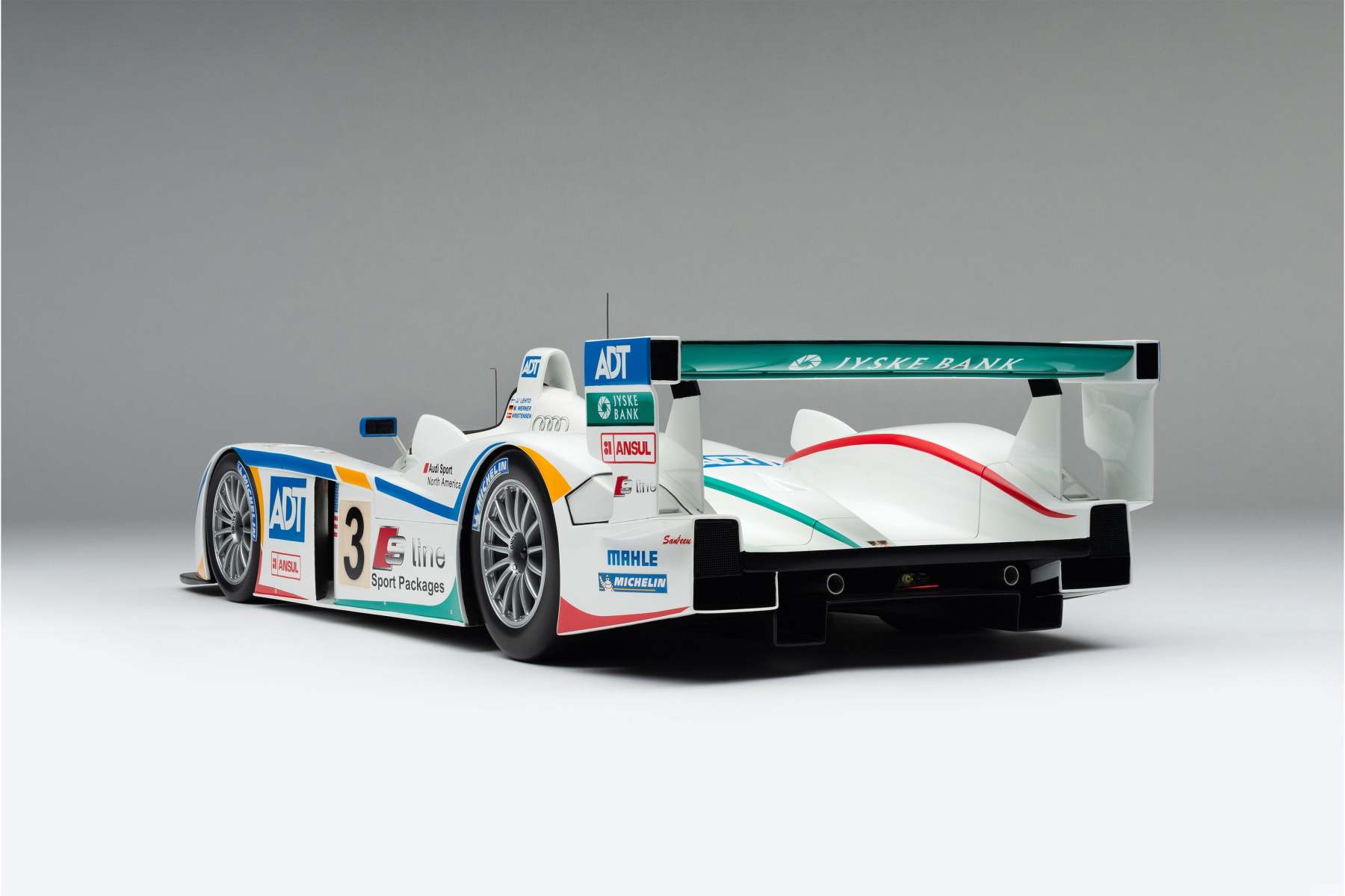 This model is a replica of the 2005 ADT Champion Racing No. 3 car which took Audi’s fifth Le Mans crown and sealed Tom Kristensen’s place in Le Mans history as he became the most successful Le Mans driver of all time. Piloted by Kristensen, JJ Lehto and Marco Werner, the No.3 qualified eighth, 4.2 seconds behind the leading Pescarolo. A flawless race, however, saw them slowly creep up the places and, by the third hour, they had overtaken their No. 2 sister car, driven by Frank Biela, Allan McNish and Emmanuele Pirro, after Pirro locked his cold tyres heavily on the run to Arnage corner and made contact with a tyre barrier.
