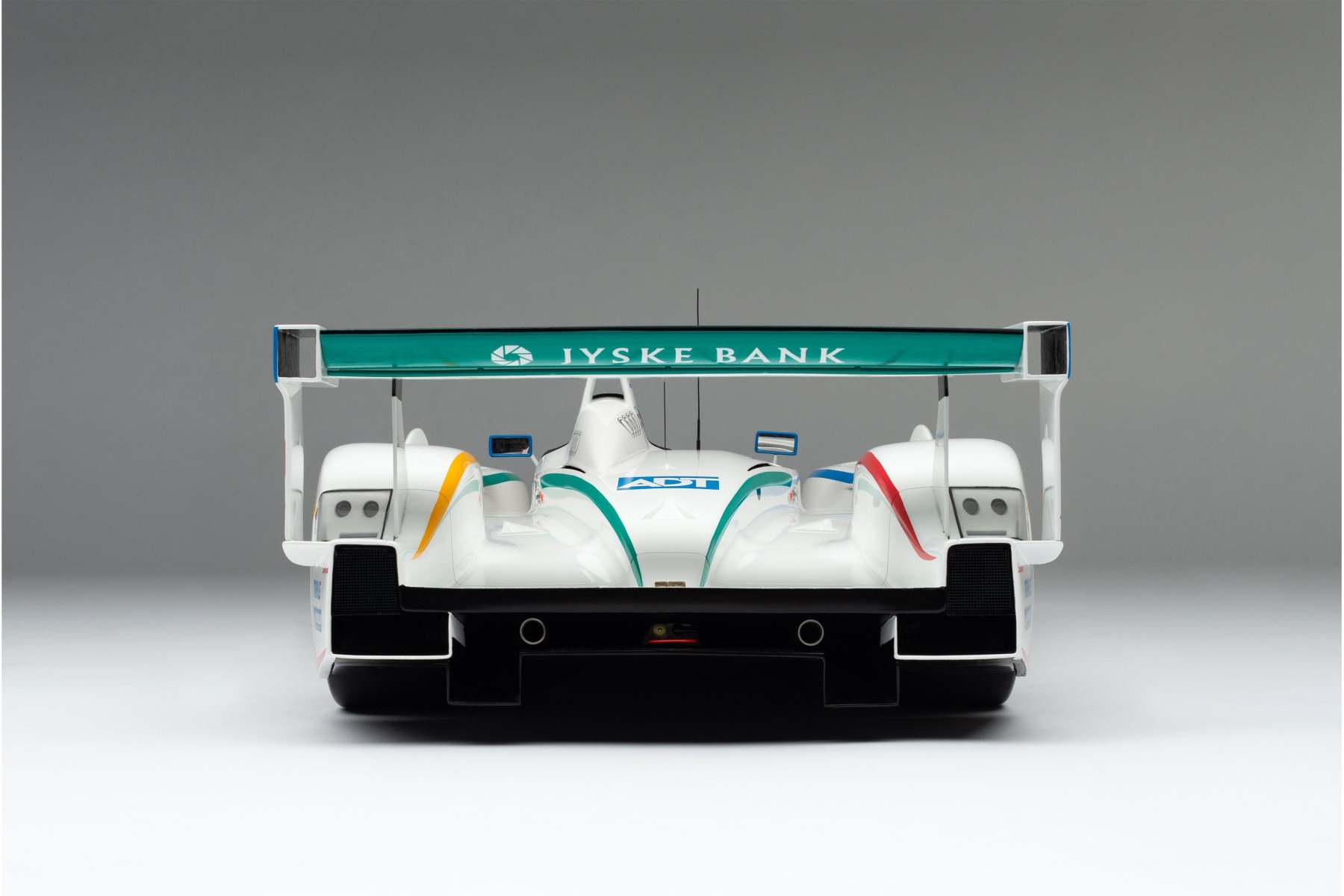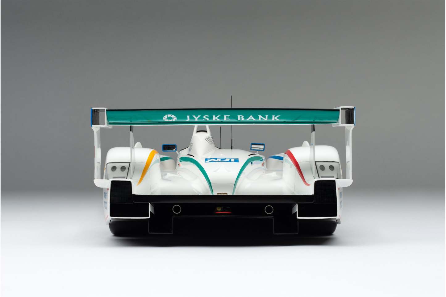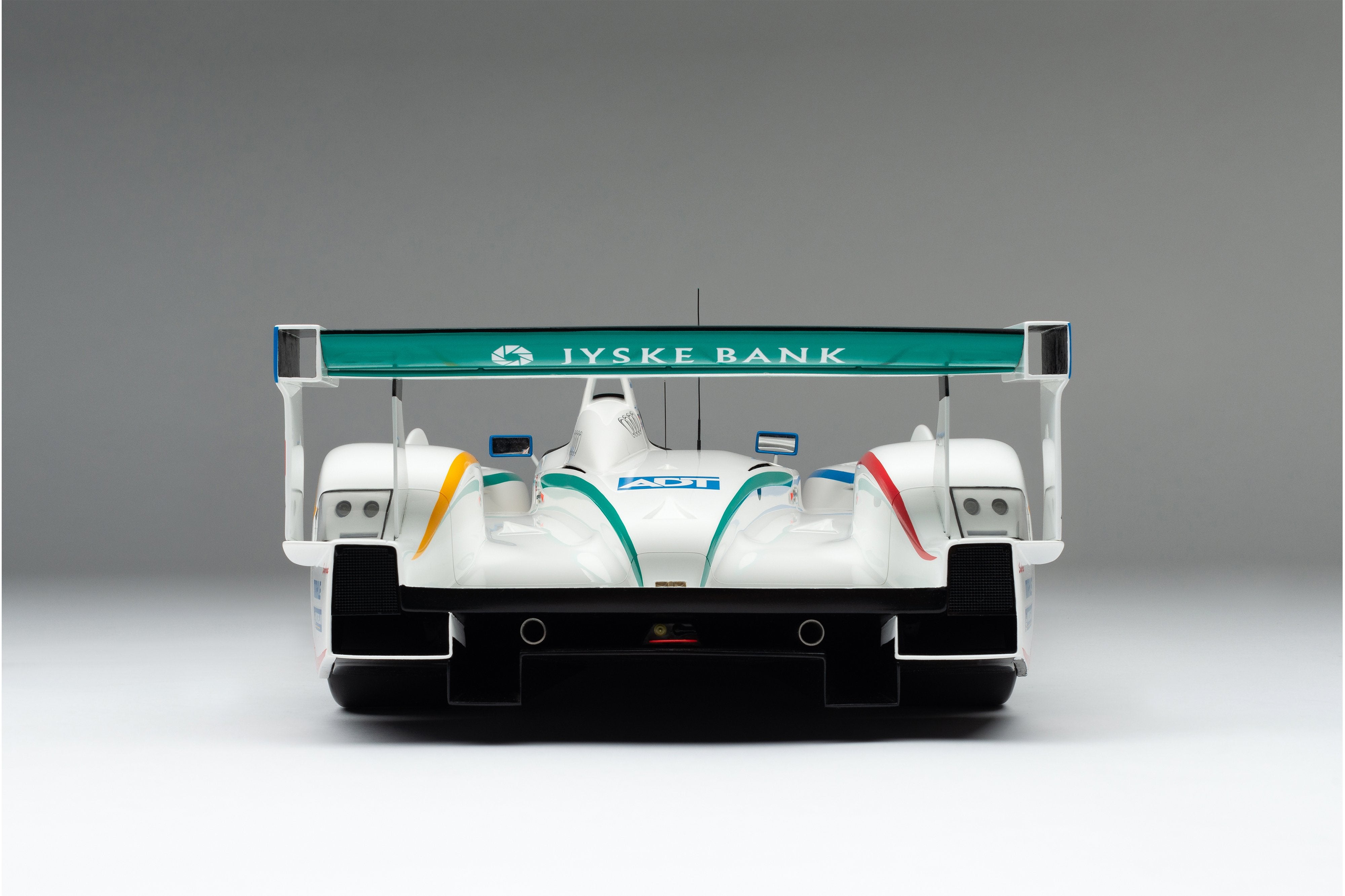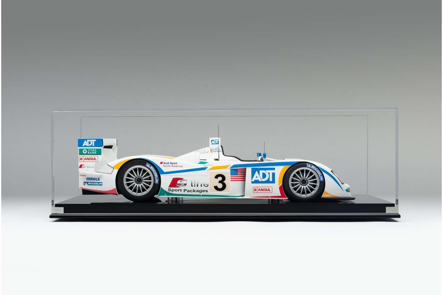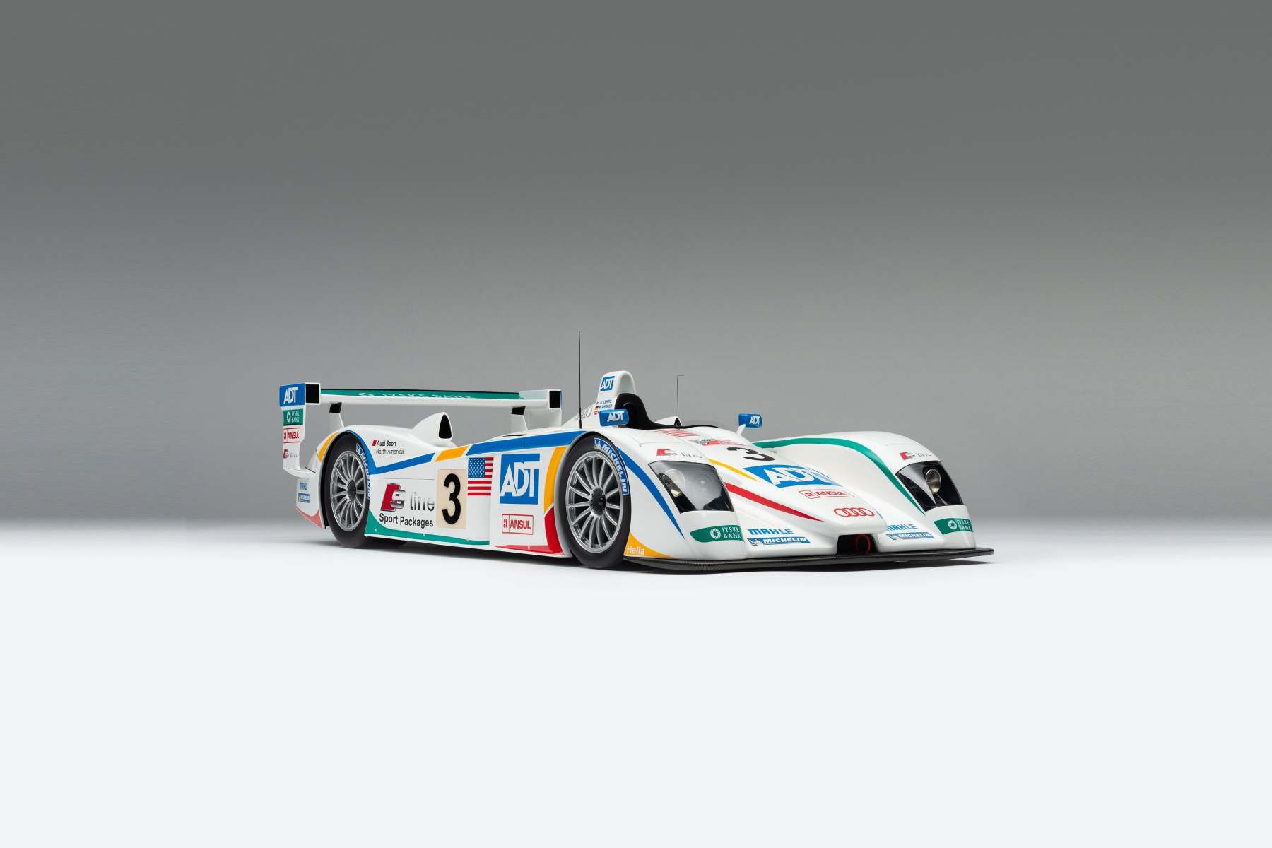 This model is a replica of the 2005 ADT Champion Racing No. 3 car which took Audi’s fifth Le Mans crown and sealed Tom Kristensen’s place in Le Mans history as he became the most successful Le Mans driver of all time. Piloted by Kristensen, JJ Lehto and Marco Werner, the No.3 qualified eighth, 4.2 seconds behind the leading Pescarolo. A flawless race, however, saw them slowly creep up the places and, by the third hour, they had overtaken their No. 2 sister car, driven by Frank Biela, Allan McNish and Emmanuele Pirro, after Pirro locked his cold tyres heavily on the run to Arnage corner and made contact with a tyre barrier.