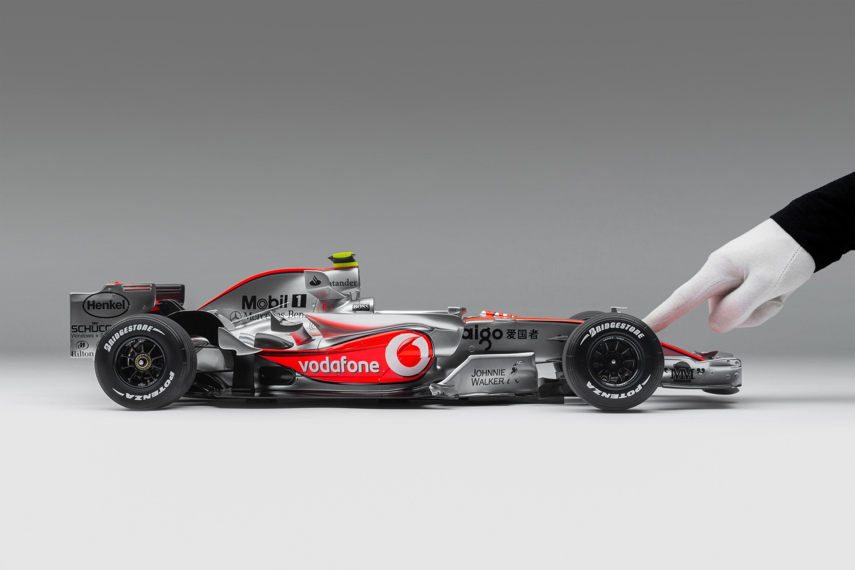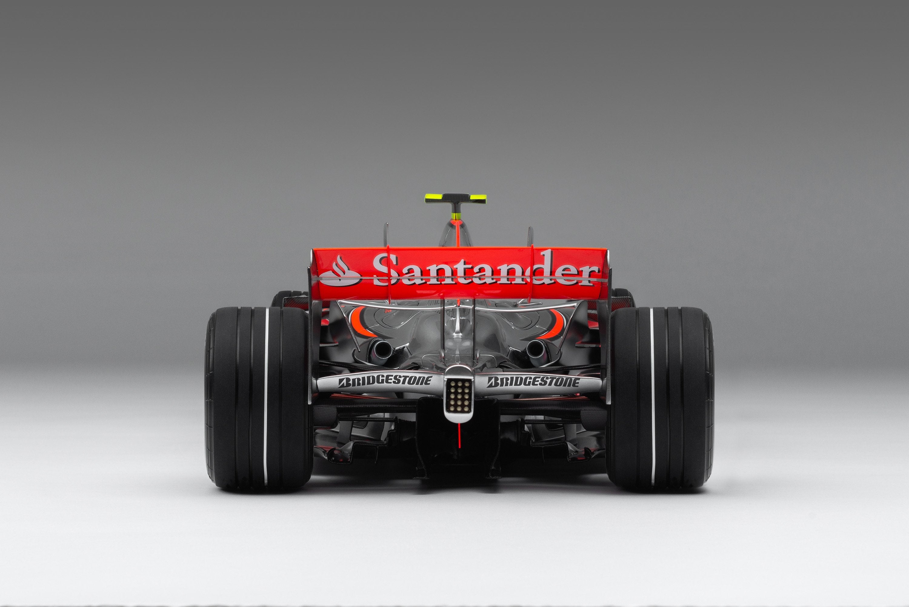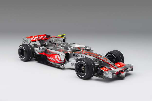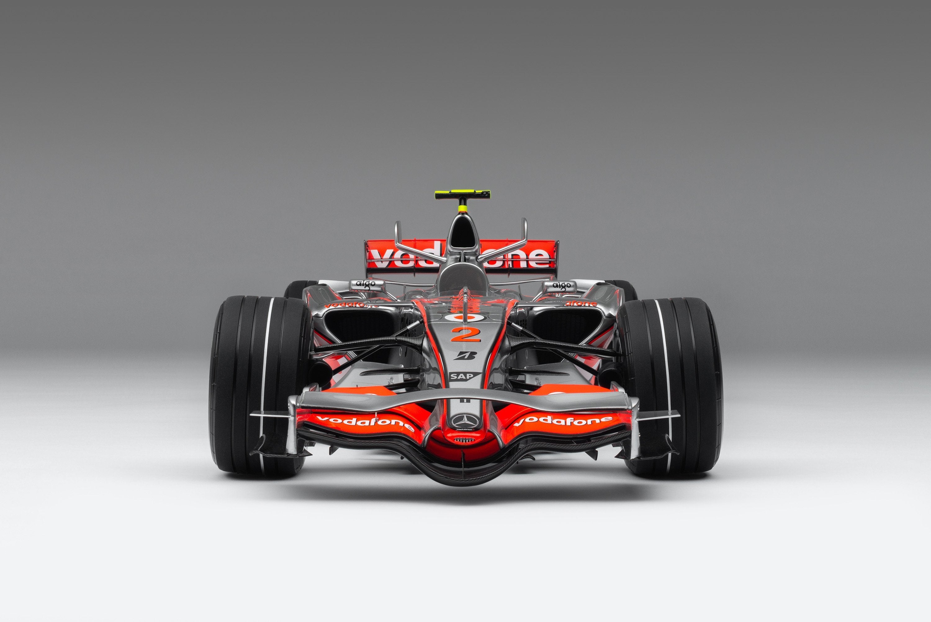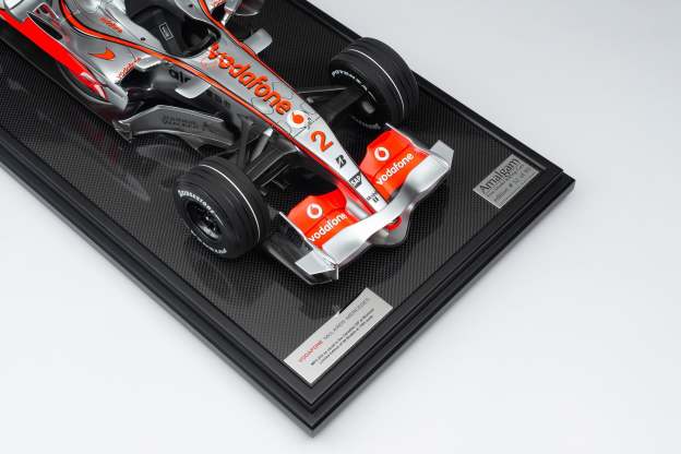 This fine model of the McLaren MP4-22 is a 1:8 scale replica of the car that Lewis Hamilton drove to his first ever Formula 1 victory at the Canadian Grand Prix on 10 June 2007. Having finished on the podium in every F1 race he had contested prior to the event, Hamilton claimed his maiden pole position in qualifying in Montreal, beating his two-time world champion team-mate Alonso by four tenths of a second. A faultless drive, despite an eventful race which featured four safety cars, delivered Hamilton to the chequered flag and his maiden Formula 1 victory.