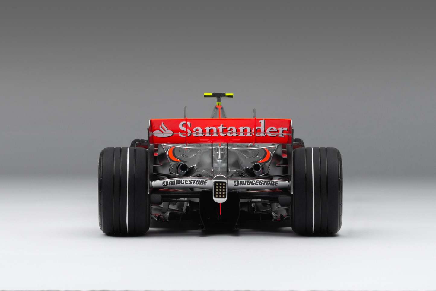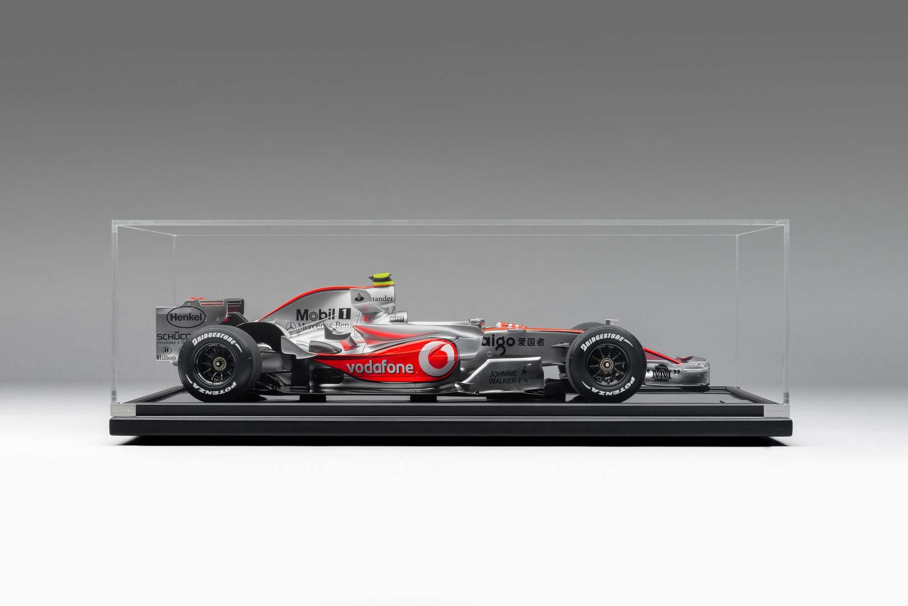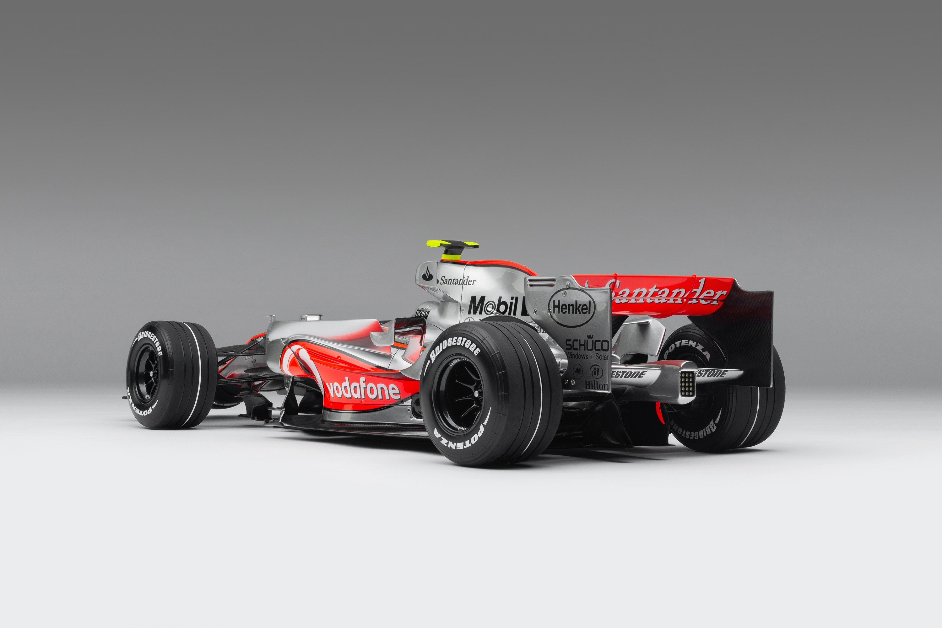 This fine model of the McLaren MP4-22 is a 1:8 scale replica of the car that Lewis Hamilton drove to his first ever Formula 1 victory at the Canadian Grand Prix on 10 June 2007. Having finished on the podium in every F1 race he had contested prior to the event, Hamilton claimed his maiden pole position in qualifying in Montreal, beating his two-time world champion team-mate Alonso by four tenths of a second. A faultless drive, despite an eventful race which featured four safety cars, delivered Hamilton to the chequered flag and his maiden Formula 1 victory.